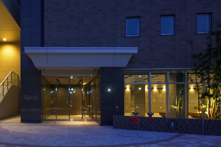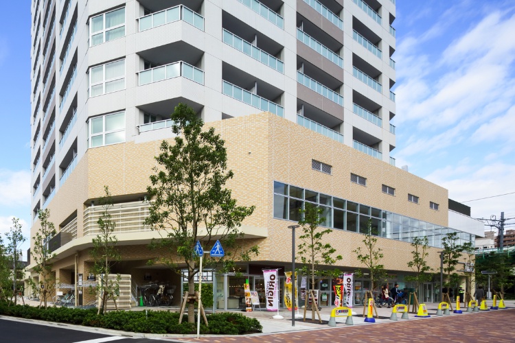 三河島の風景に上質な雰囲気を添えるようなファサードがデザインされています。天然石貼りの柱で構成したゲート風の意匠は、上品かつ主張しすぎない存在感となっています。